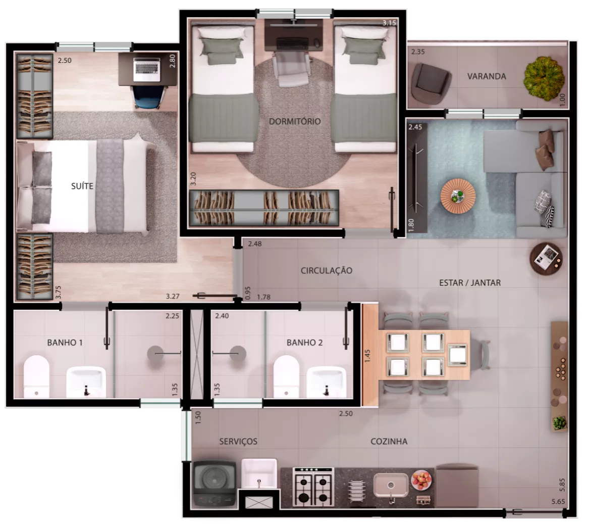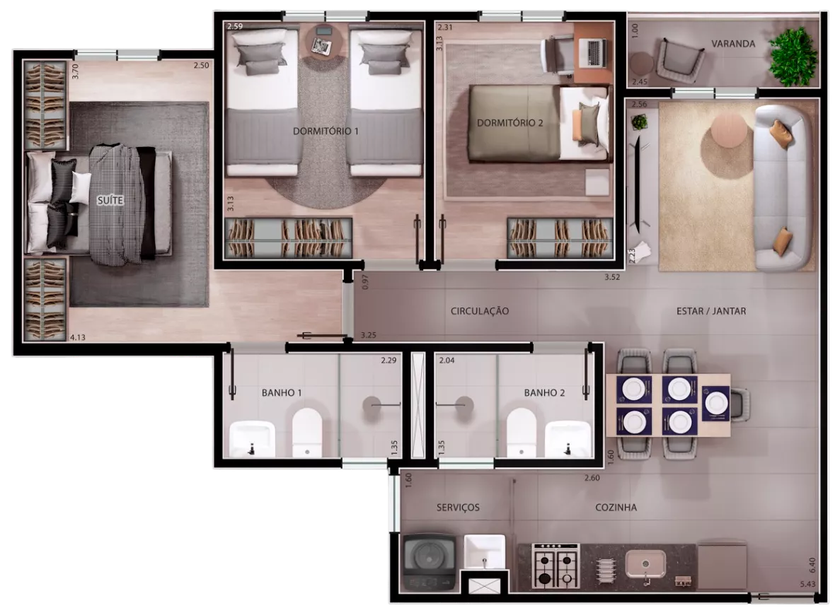 Apartamentos de 2 ou 3 quartos sendo 1 suíte